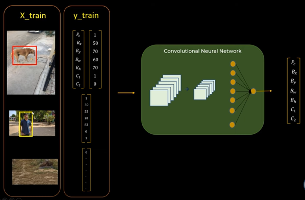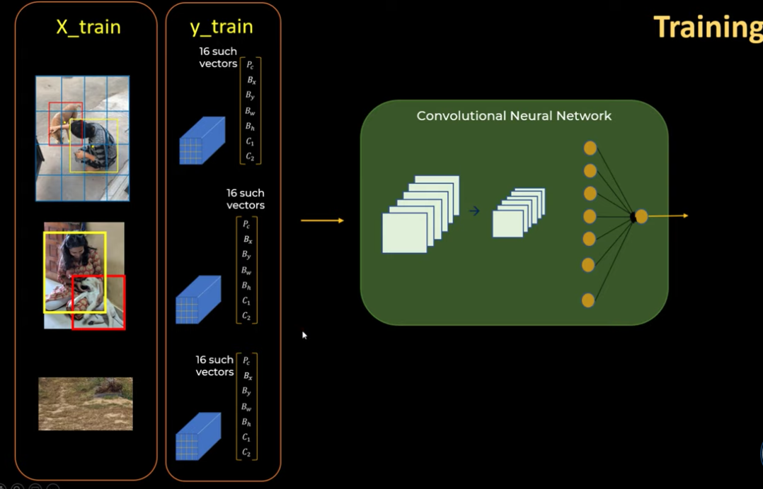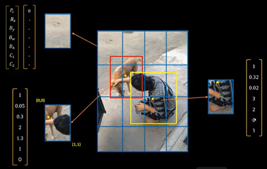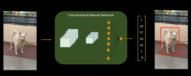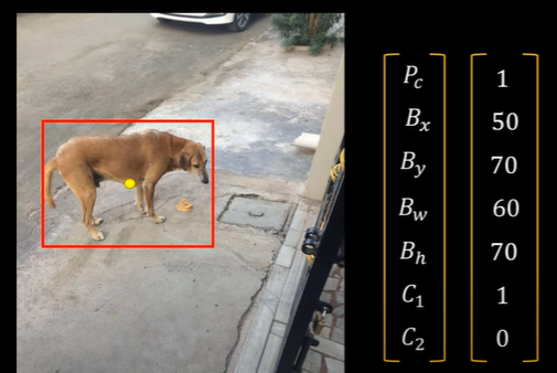 - 새 이미지를 입력하면 특정 벡터를 알려줌. C1이 1로 설정되어 있기 때문에 이것이 Dog라는 것을 알려주고 Boundary Box도 알려줌