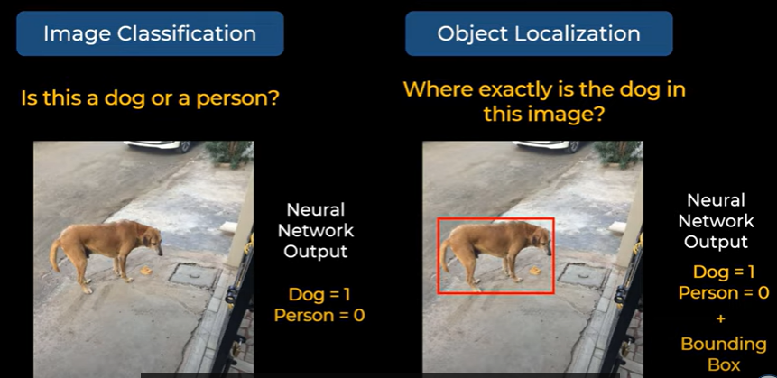 - Object Localizaion은 어떤 클래스인지 알려주는 것 뿐만 아니라 Boundoing Box를 통해 이미지 내 객체의 위치도 말해줌