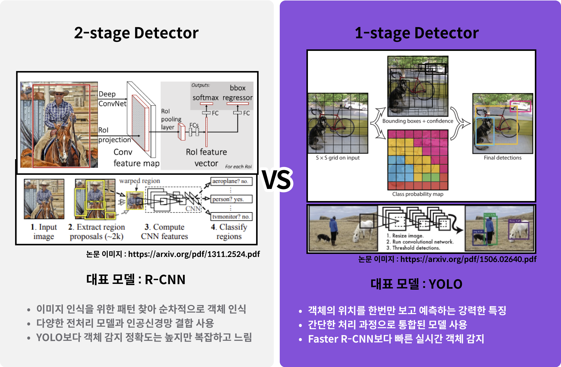 - 이미지 전체를 한번만 봄: YOLO 이전의 R-CNN은 이미지를 여러장으로 분할하고, CNN 모델을 이용해 이미지를 분석했음. 그렇기 때문에 이미지 한장에서 Object Detection을 해도 실제로는 여러장의 이미지를 분석하는 것과 같았음. 하지만 YOLO는 이러한 과정 없이 이미지를 한 번만 보는 강력한 특징을 가지고 있음