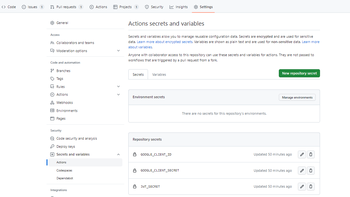 여기서 [New repository secret]를 클릭해 필요한 환경변수들을 정의해준다!