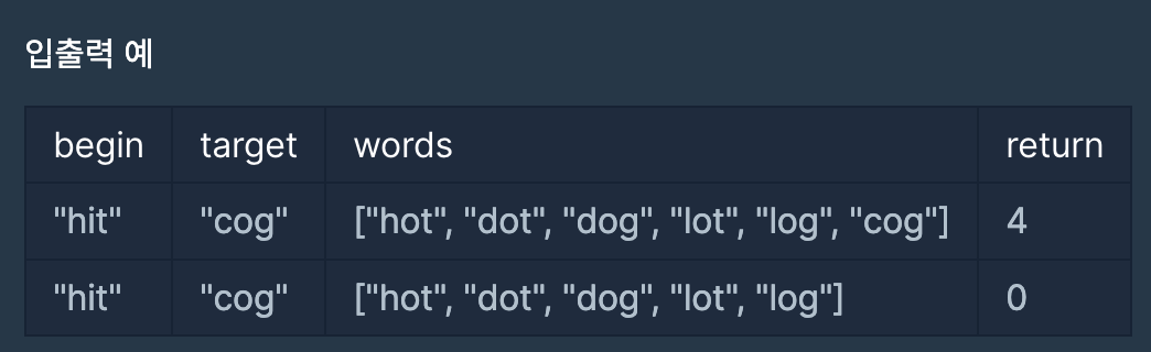 예를 들어 begin이 "hit", target가 "cog", words가 ["hot","dot","dog","lot","log","cog"]라면 "hit" -> "hot" -> "dot" -> "dog" -> "cog"와 같이 4단계를 거쳐 변환할 수 있습니다.