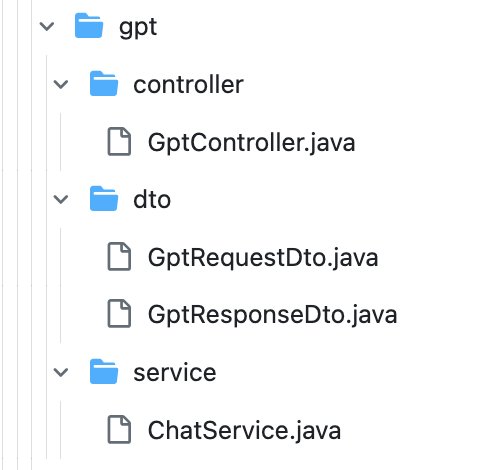 - GptRequestDto.java: 이 파일은 GPT 관련 HTTP 요청에서 사용되는 데이터 전송 객체(DTO)입니다. 요청에 필요한 데이터를 캡슐화합니다.