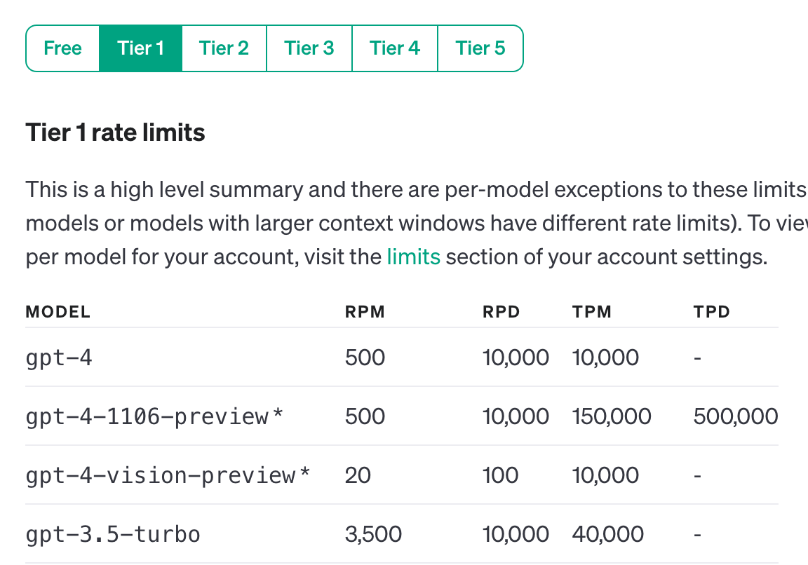 유료 계정의 minimum이 5달러이므로 5달러만 결제해놓고 GPT를 사용한다면 Tier 1에 속하게 되는데요.