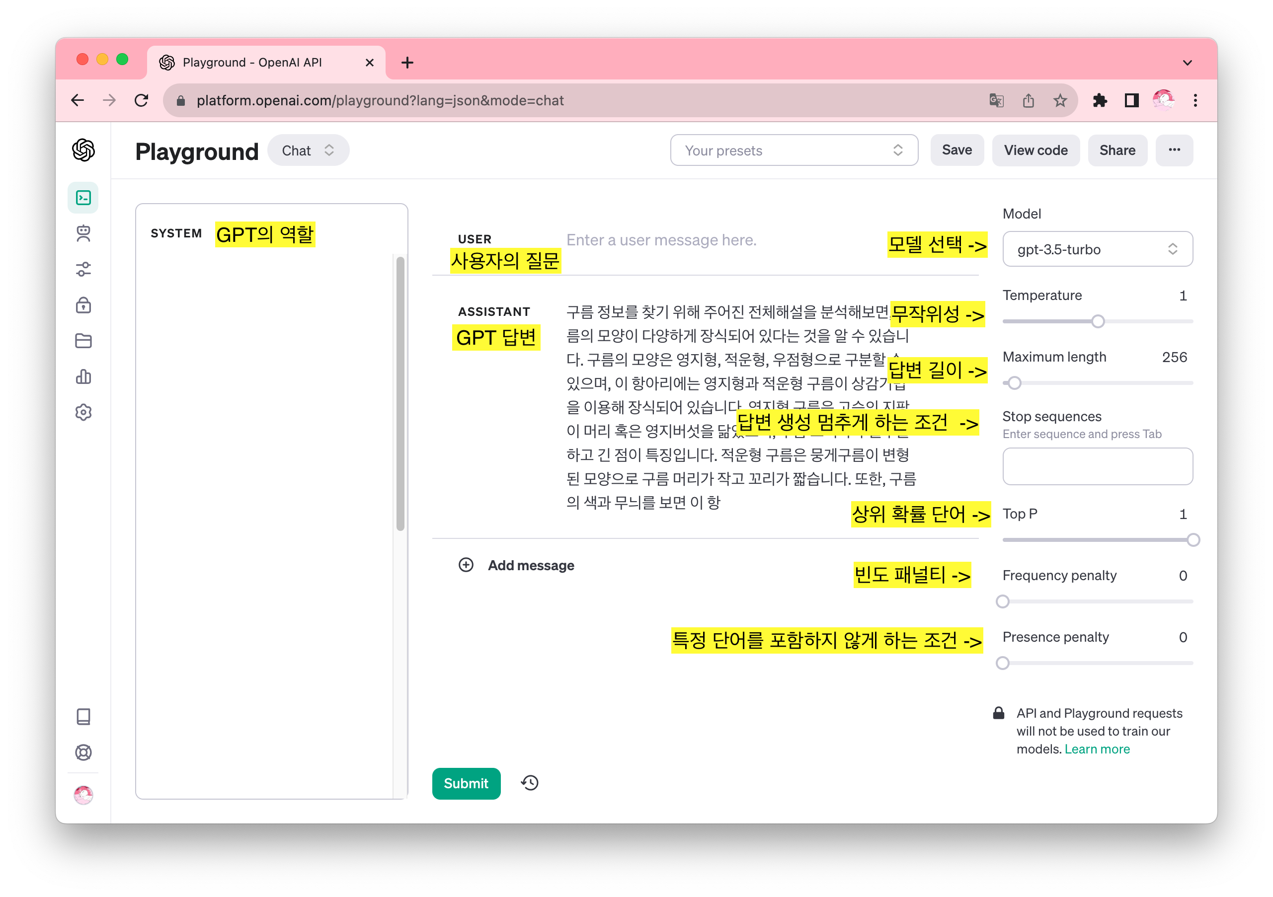 - USER & ASSISTANT : 사용자의 질문과 챗GPT의 답변 창입니다.