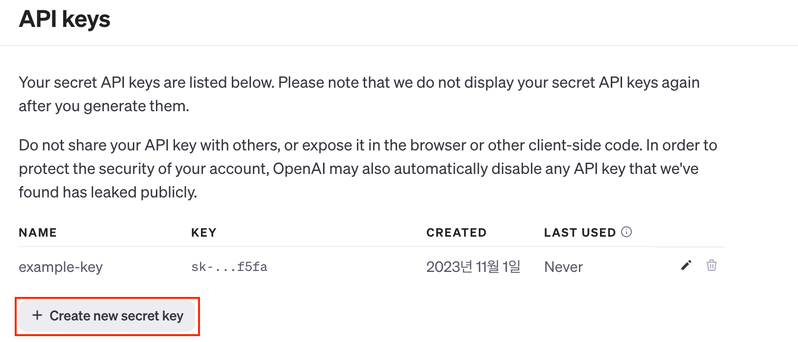 [Create new secret key] 를 눌러 서비스 키를 생성해봅시다.