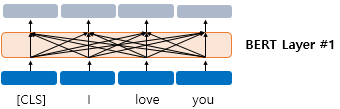 - [CLS] 벡터는 BERT의 입력으로 사용되었을 당시) 단순히 임베딩 벡터였지만, BERT를 지나고 나서는 [CLS], I, love, you라는 모든 단어 벡터들을 모두 참고한 후에 문맥 정보를 가진 벡터가 됩니다!