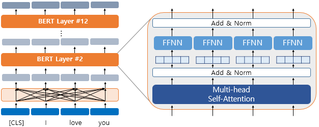 - 하나의 단어가 모든 문맥을 참고하는 연산은 사실 BERT의 12개의 층에서 전부 이루어지는 연산입니다.
