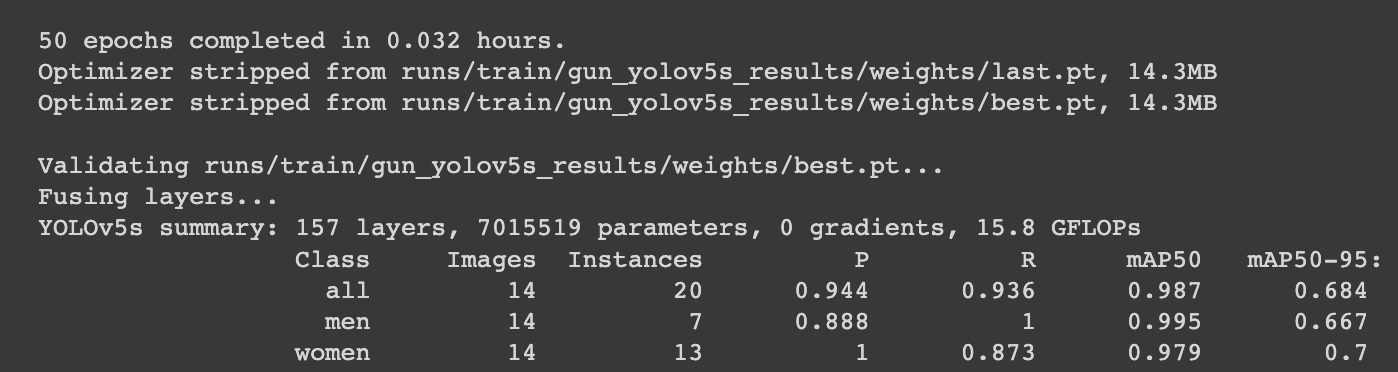 성공적으로 학습이 끝나면 다음과 같은 결과를 볼 수 있습니다! best.pt파일이 생긴 디렉토리도 알려주네요.