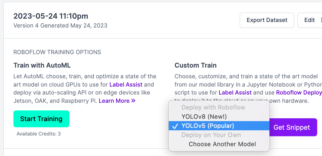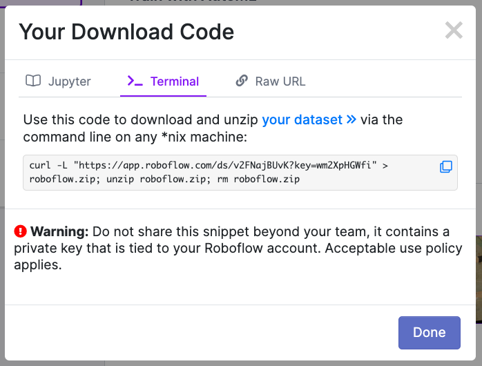 YOLOv5 (Popular)로 [Get snippet] 클릭 -> Terminal 탭에 있는 다운로드 코드를 복사해주세요!