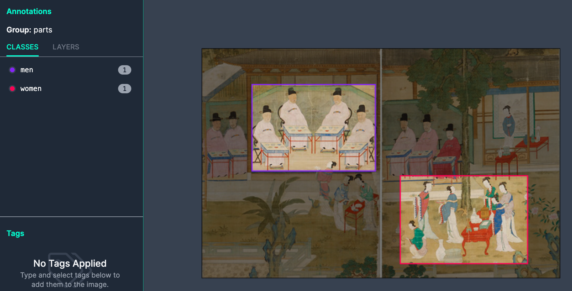 저는 <권대운 기로연회도> 이미지를 업로드해 'men', 'women' 영역의 bounding box를 만들어주었습니다!
