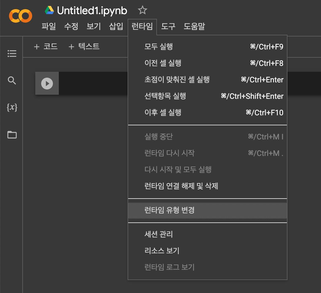 생성된 파일에 접속해 런타임 > 런타임 유형 변경을 선택해 하드웨어 가속기를 GPU로 변경해주고 [저장]을 누릅니다.